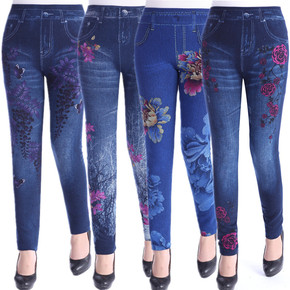 大码高弹弹力免烫显瘦仿牛仔薄款松紧腰中老年女士印花...
