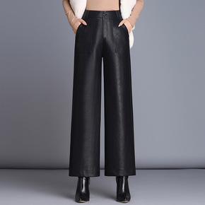 皮裤阔腿裤高腰宽松休闲直筒裤女2021秋冬新款中年...
