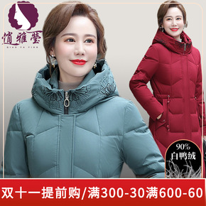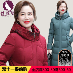 俏雅莹妈妈装冬季新品连帽白鸭绒长款过膝连帽轻盈中老...