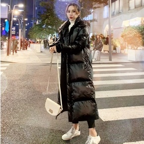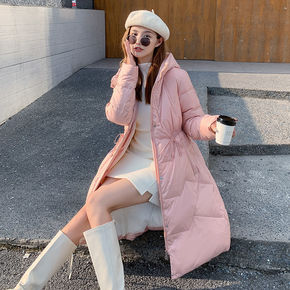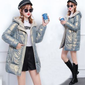 免洗亮面羽绒棉服女2021新款洋气中长款棉衣连帽粉...