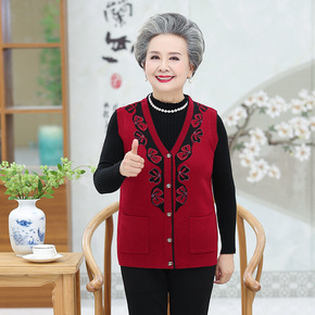 秋季新款V领无袖中老年女装针织马甲带背心时尚保暖宽...