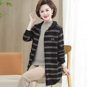 2022春季新款中老年女装中长款连帽卫衣条纹拉链毛...