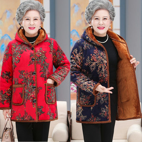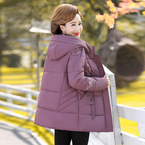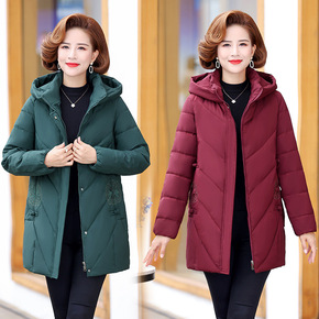 中老年女装冬装外套妈妈中长款加绒加厚棉衣连帽棉服奶...