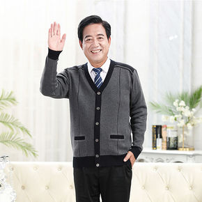 新款中老年春秋冬装男士老人保暖针织开衫爸爸装V领大...