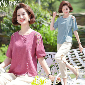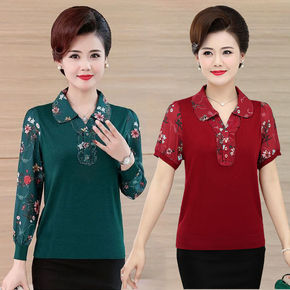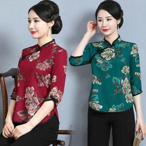 中老年女装秋季旗袍领中袖T恤女民族风妈妈装遮肚洋气...