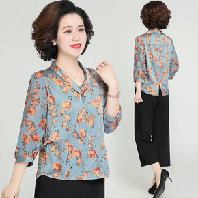 妈妈洋气大码上衣中年女春秋装七分袖衬衫中老年蕾丝雪...