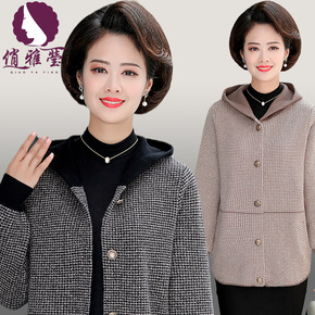 俏雅莹妈妈装新款秋季外套暖秋毛衣连帽小格子针织衫中...