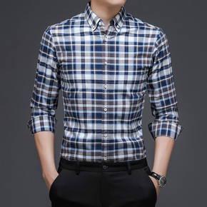 2021男士格子翻领衬衫长袖春秋新款休闲上衣中年爸...