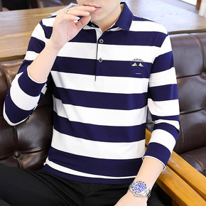 男士长袖T恤纯棉春秋季潮流ins条纹上衣爸爸装PO...