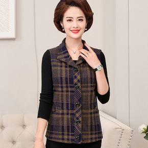中年女装春秋中长款格子马甲妈妈秋冬毛呢背心外套西装...