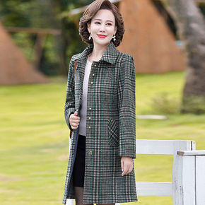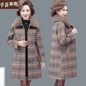 春秋新款中老年洋气妈妈装时尚长袖中长款格子毛呢女装...