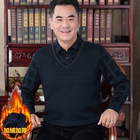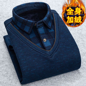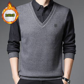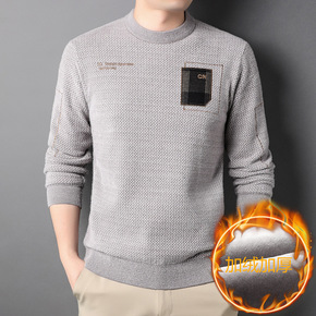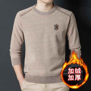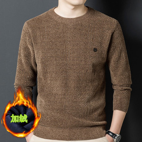 秋冬季男士加绒加厚针织衫毛衣纯色圆领保暖上衣雪尼尔...