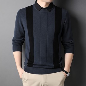 2021秋冬衬衫领针织衫男士薄款条纹拼色毛衣男韩版...