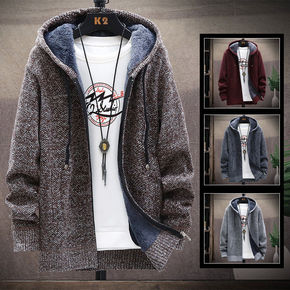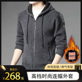 秋冬新款加绒加厚男装雪尼尔毛衣大码风衣中长款连帽外...