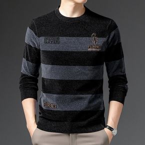 2021秋冬新款雪尼尔圆领针织衫男百搭休闲打底衫条...