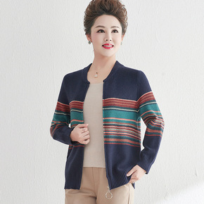 妈妈春秋装外套短款洋气中老年女装棒球服领条纹针织开...