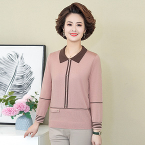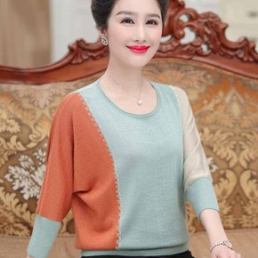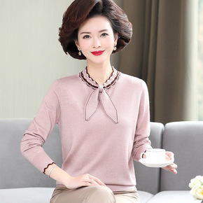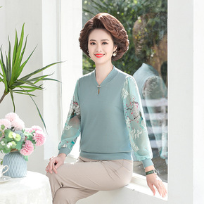 妈妈洋气秋装纱袖针织上衣中老年女春装打底小衫长袖宽...