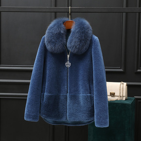 海宁羊剪绒大衣女中老年妈妈短款狐狸毛领皮毛一体羊毛...