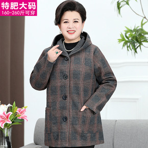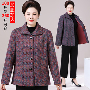 中老年人女春秋装加肥加大码中长款格子毛呢外套胖妈妈...