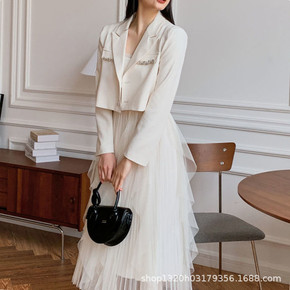 小香风西装短款外套女春网纱拼接木耳边吊带裙连衣裙套...