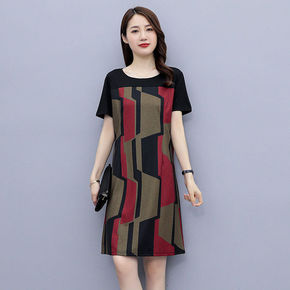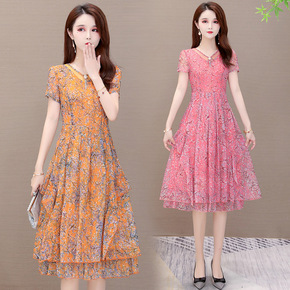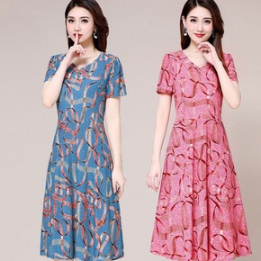 跨境外贸印花连衣裙女夏新款遮肚子显瘦中年妈妈洋气宽...