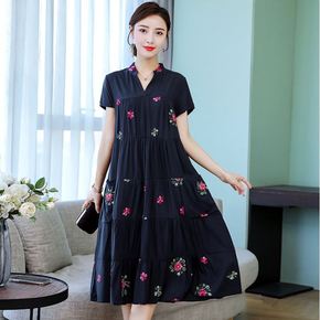 跨境款中老年印花连衣裙女长款夏季新款宽松大码V领收...