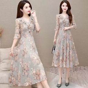 中长款连衣裙2022夏季新款高贵阔太太中老年妈妈大...