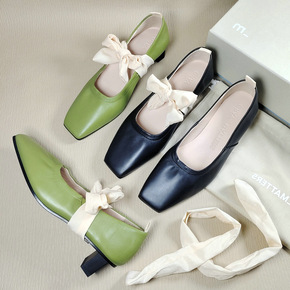 日韩原单小众真皮女单鞋斜方头3.5CM低跟蝴蝶结复...