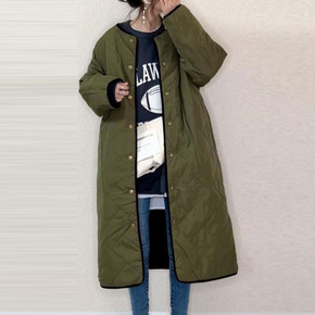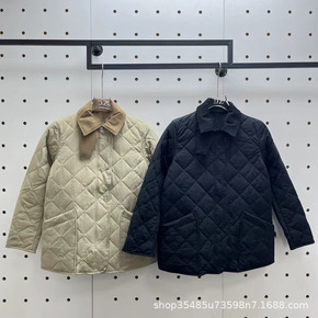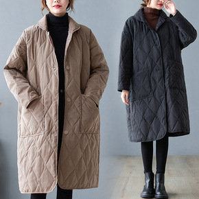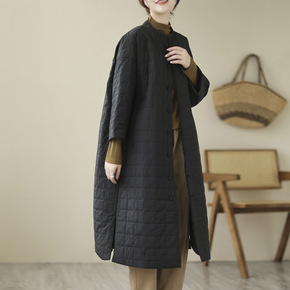 秋冬新款圆领纯色圧格复古盘扣宽松显瘦百搭夹棉长款外...