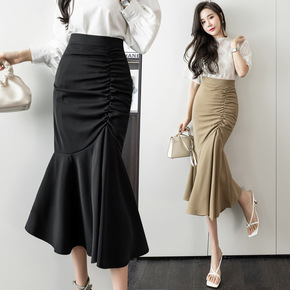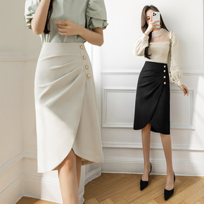 2022春夏新款复古褶皱开叉包臀裙女中长款A字裙不...