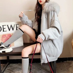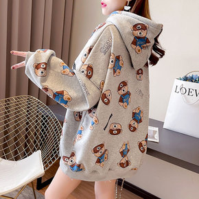 慵懒风加绒大码中长款卫衣外套女秋冬新款洋气大码毛绒...
