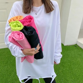 秋季韩版休闲时尚纯色净版破洞宽松大码中长款长袖T恤...