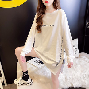 T恤女2021春秋季新款纯色长袖休闲宽松大码中长款...
