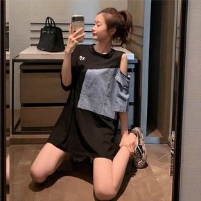 2088#网红韩版新款露肩短袖T恤女宽松设计感中长...