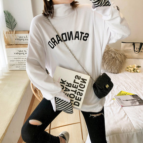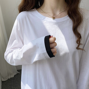 2021秋季新款韩国纯棉长袖t恤女宽松撞色中长款白...