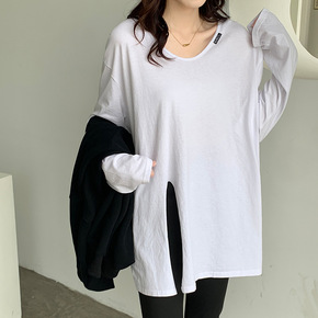 中长款显瘦早秋上衣长袖港味打底衫2021新款宽松v...