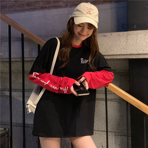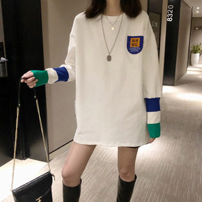 2021春秋装撞色拼接长袖T恤女大码宽松中长款磨毛...