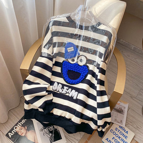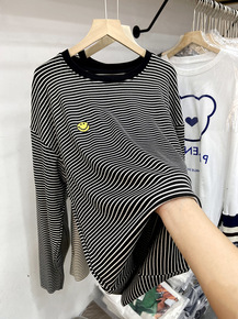搭上衣宽松内潮笑脸打底磨毛衫春秋t恤德绒条纹长袖中...