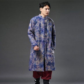 中国风男装冬装立领唐装棉衣男棉麻扎染印花中老年棉服...