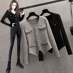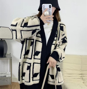 宽松显瘦设计感黑白撞色毛衣外套女开衫秋冬中长款气质...
