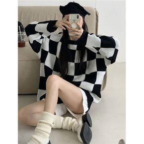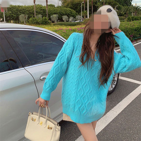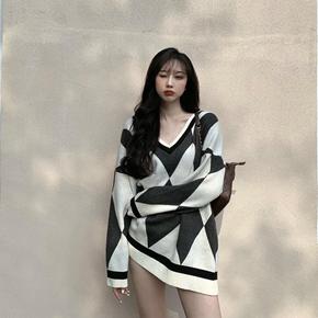 V领毛衣女慵懒风宽松复古菱格中长款针织衫长袖春季显...