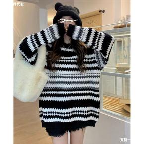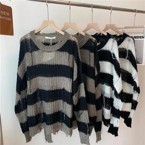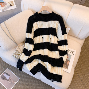 破坏感条纹毛衣女秋季针织套头衫宽松显瘦中长款上衣慵...