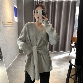 洋气针织衫上衣中长裙显瘦长袖v领绑带宽松慵懒风毛衣...