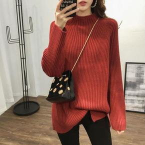 宽松针织衫卷边半领厚实显瘦竖纹理中长款坑条打底毛衣...