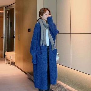 秋装2021年新款针织开衫秋冬翻领外套女士中长款宽...