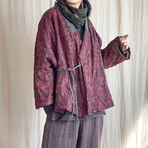 青莲/原创香云纱印花亚麻女式棉衣 复古棉麻拼布棉服...