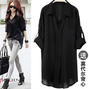 装女新款雪纺衫长袖宽松衬衫胖MM斤女中长款衬衣女...