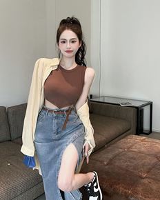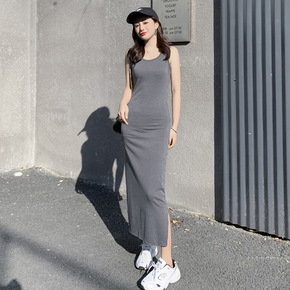 夏款修身侧开叉无袖背心裙女中长款字连衣裙纯色过膝长...