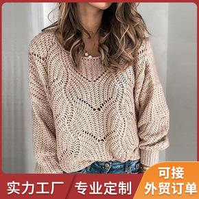 欧美跨境圆领毛衣女装打底衫 2021新品镂空纯色套...