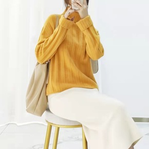 2021新款纯山羊绒两翻领宽坑条显瘦针织衫女纯色加...